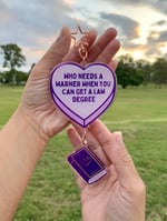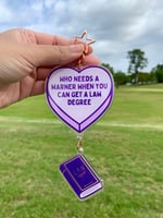 Calling all law baddies! This Legally Blonde - inspired Keychain features two epoxy coated charms, the first measuring 3 inches with the quote "Who needs a Warner when you can get a law degree?" The second charm features a book of law and measures 2 inches. The keychain also has a rose gold star clasp. It is perfect for any law school student or Legally Blonde fan!