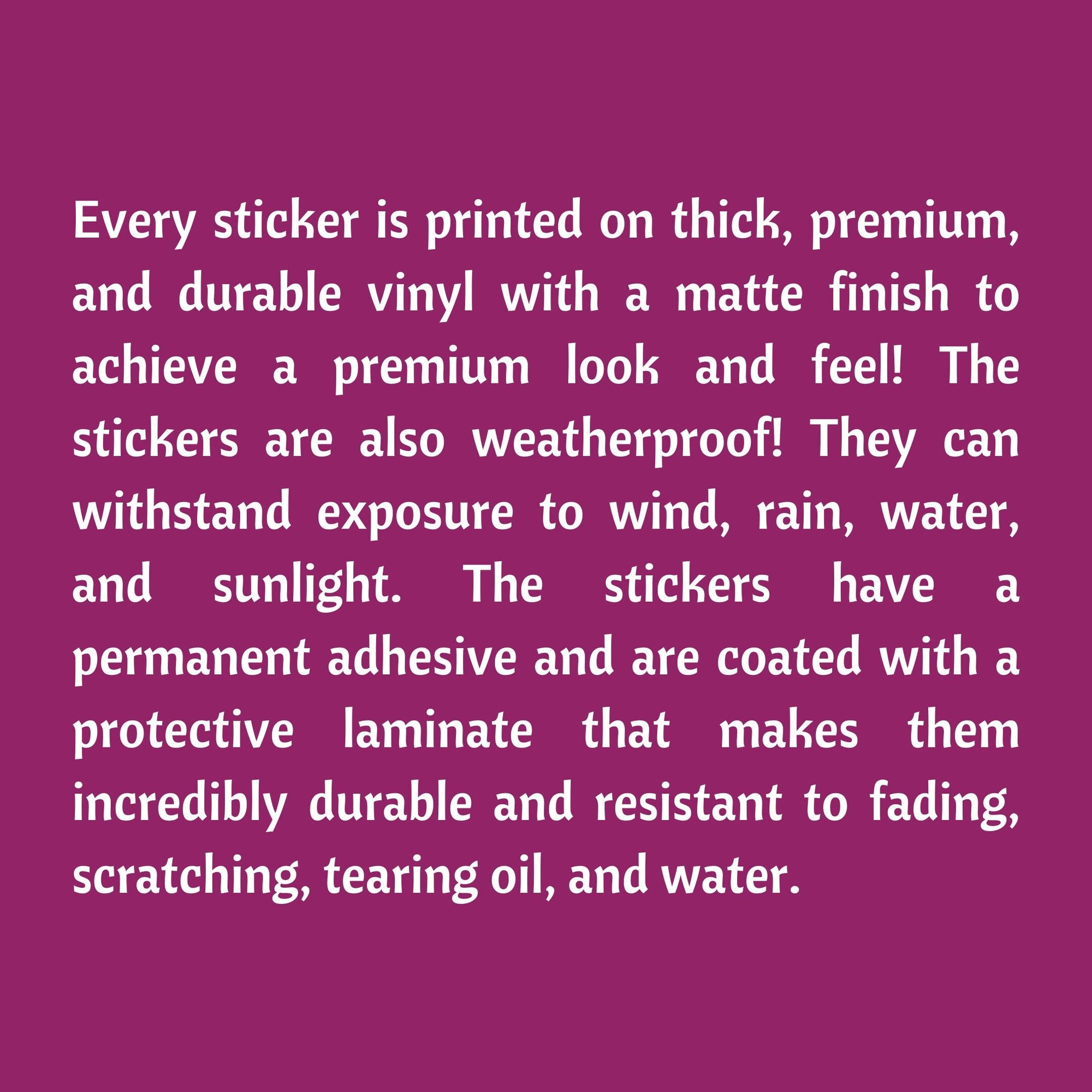 Every sticker is printed on thick, premium, and durable vinyl with a matte finish to achieve a premium look and feel! The stickers are also weatherproof! They can withstand exposure to wind, rain, water, and sunlight. The stickers have a permanent adhesive and are coated with a protective laminate that makes them incredibly durable and resistant to fading, scratching, tearing oil, and water. This makes them perfect for use on water bottles, laptops, and phones. I hope you love them as much as I do!