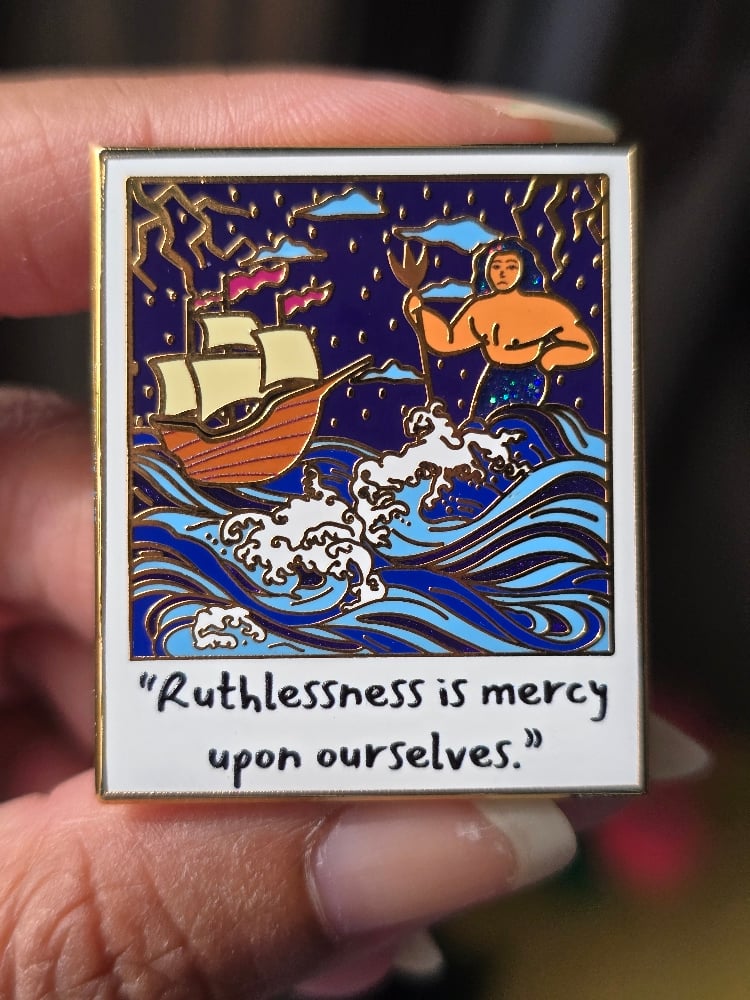 This pin is inspired by the song, Ruthless, from Epic, The Musical! Of course I had to make Poseidon's hair and mermaid tail to be glitter! lots of wave details and ofc, had to feature our favorite King of Ithaca's ship! Pin comes with a custom backing card featuring a mini print you can cut out. Pin features two backings, rubber clasp, measures 1.5 inches, and has gold plating.