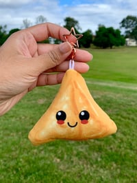 Say hello to the reversible mood samosa keychain! The material is made from soft plush and is stuffed to create a mini samosa! Turn it over for a happy samosa or an angry samosa. The keychain measures 3 inches and has a rose gold star clasp.